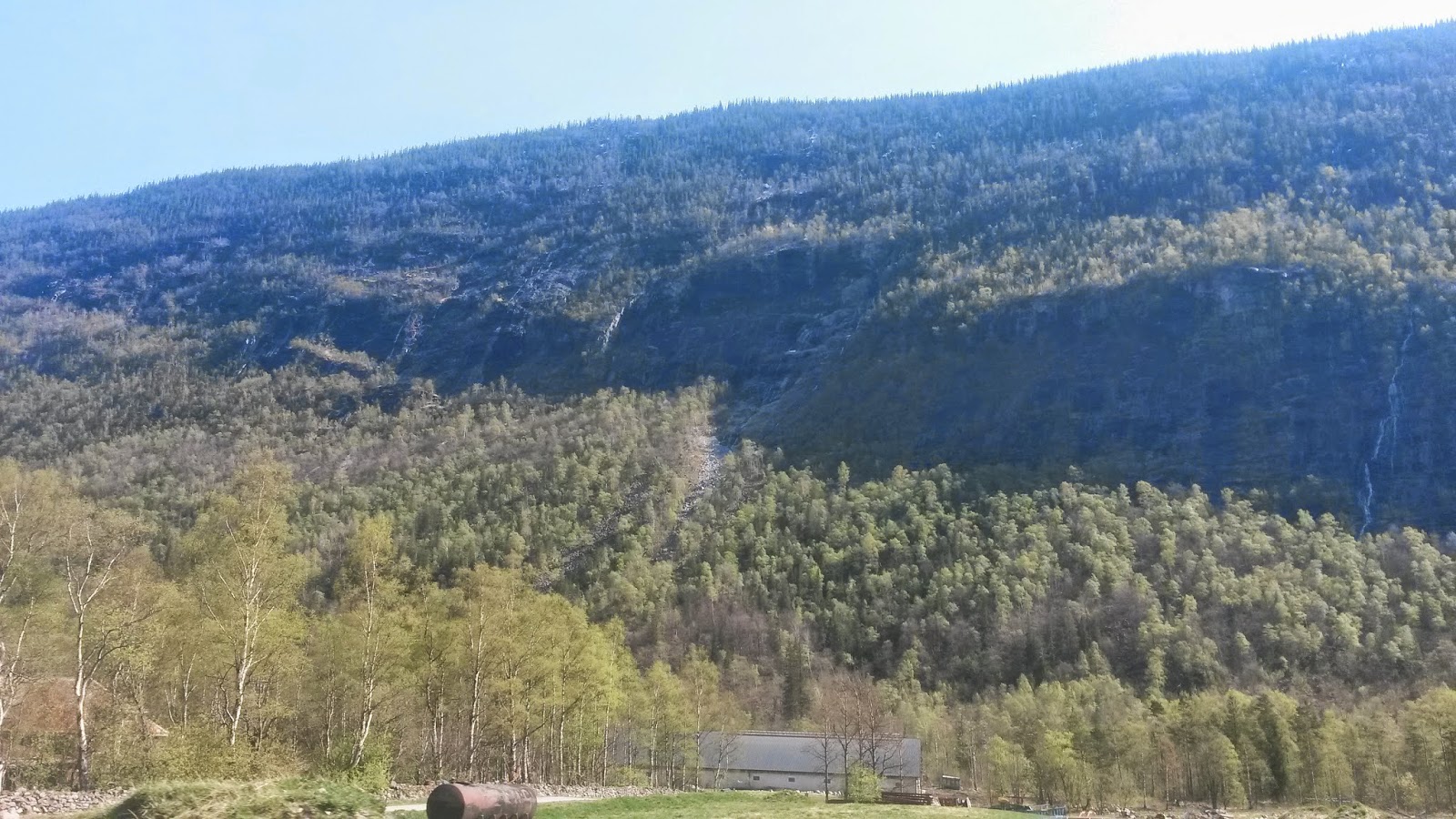 Przy północnum krańcu jezioro rozszesza się i dzieli na dwie odnoggi, my pojechaliśmy wzdłuż krótszej w kierunku zachodnim, do Rjukan, dlektując się widoczną na wprost Gaustatoppen (1883 m n.p.m.) i ogromnym wodospadem spływającym po jej zboczu (104 m wysokości)